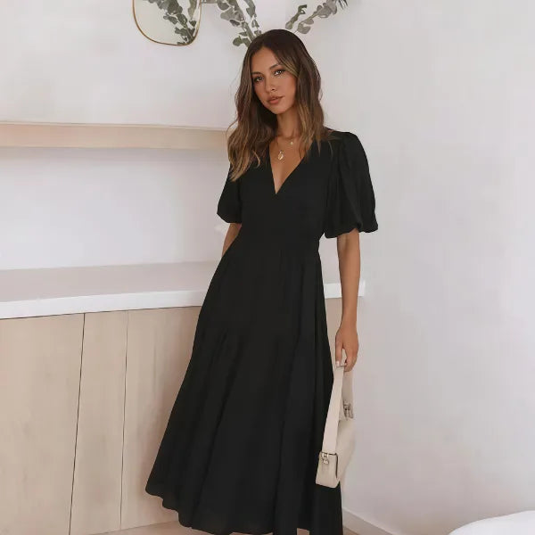 Double Take Full Size V-Neck Balloon Sleeve Tiered Dress with Pockets